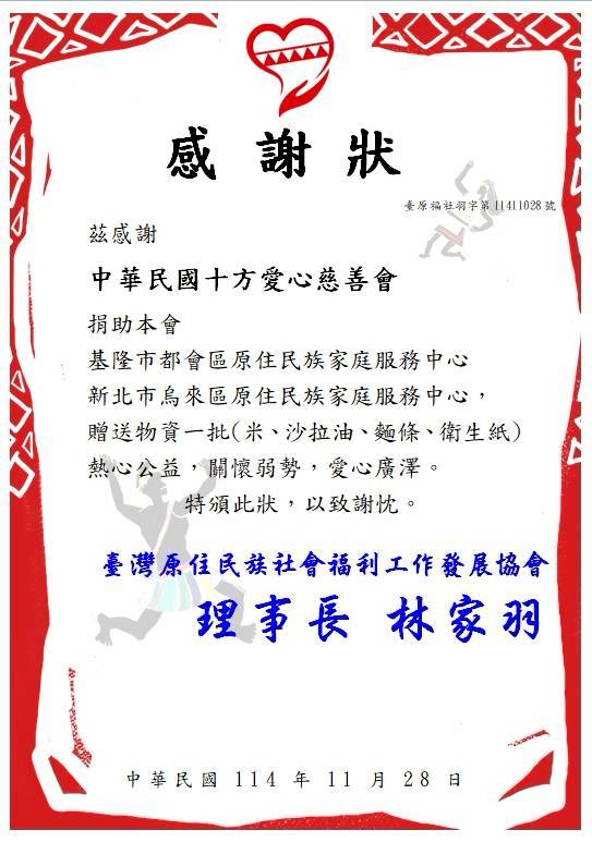 到基隆市都會區原住民族家庭服務中心,捐助關懷物資一批,讓愛心延伸
